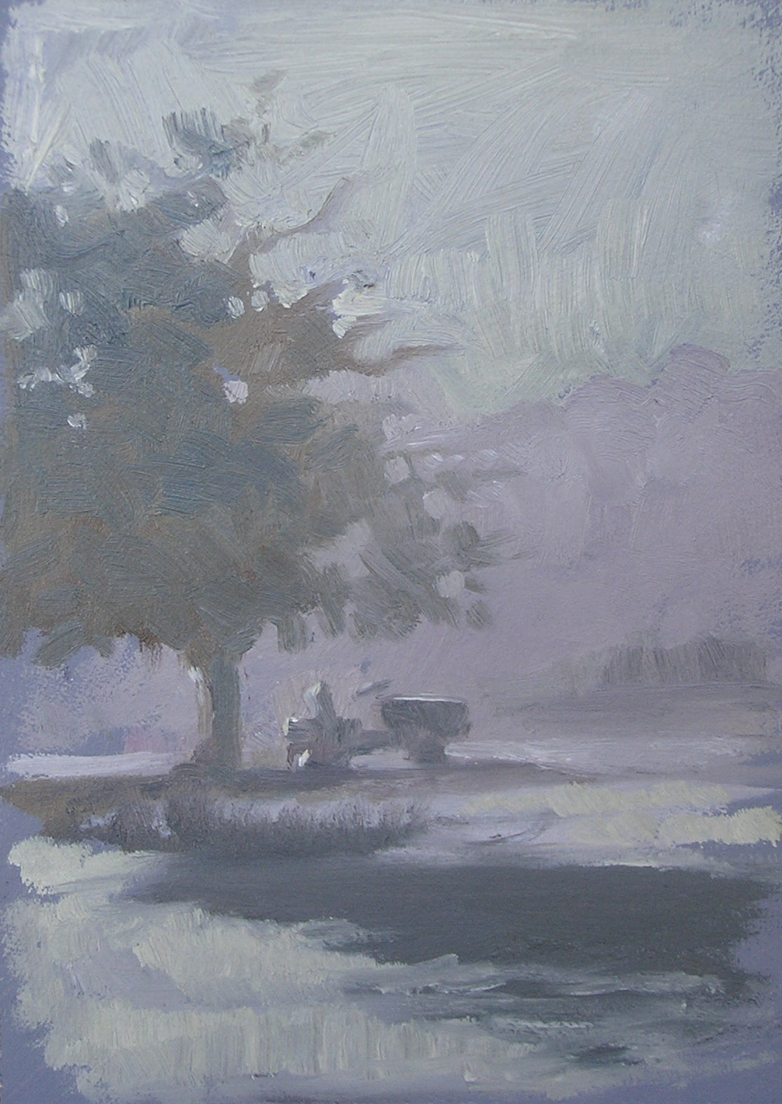 The painting here was a quick oil study on panel I did last week when the fog filled the yard before the sun climbed over the tree line. I had to work quickly, because the light changed every minute, but sometimes that forces you to make better decisions in the painting process. There's our little tractor, a gift from a customer, awaiting a mower attachment Bill has his heart set on. Maybe by the spring he'll be able to mow down the weeds that make pulling the chicken tractors a challenge. (They have fertilized so well, of course the weeds are happy.)